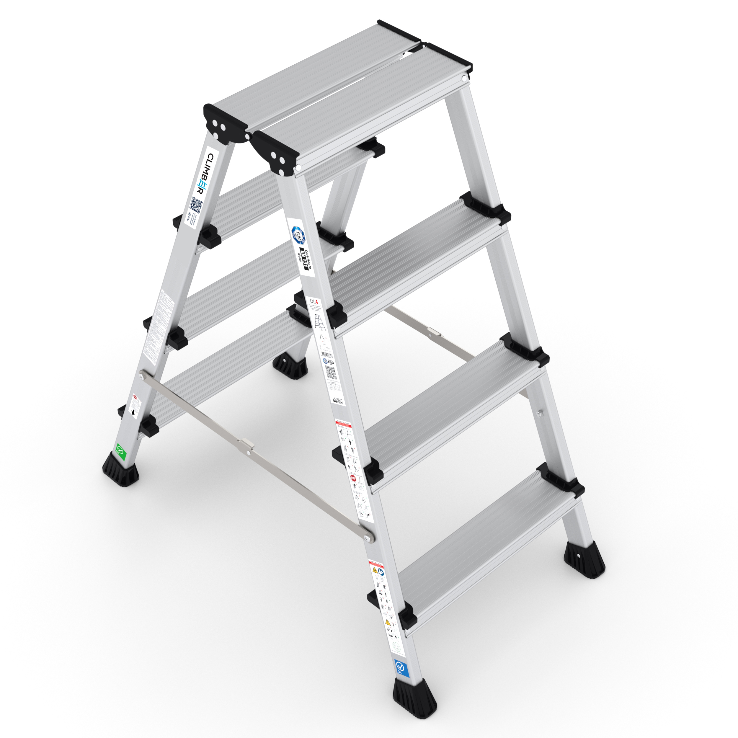 Climber Bukk er en lett kvalitetsbukk i aluminium med 80 mm dype sklisikre trinn. 2x2 trinn veier kun 2,1 kg! Sidevangene er overflatebehandlet og helt svertefrie, slik at man ikke blir sort på hendene og unngår å sverte vegger og interiør. Bukken er utstyrt med bånd mellom stigedelene og og gode stigesko for et godt feste (avstiverstag på 2x4 trinn).Climber Bukk egner seg svært godt til maling, vask og annet vedlikehold. Testet og godkjent etter EN131 og maksimal belastning 150 kg.