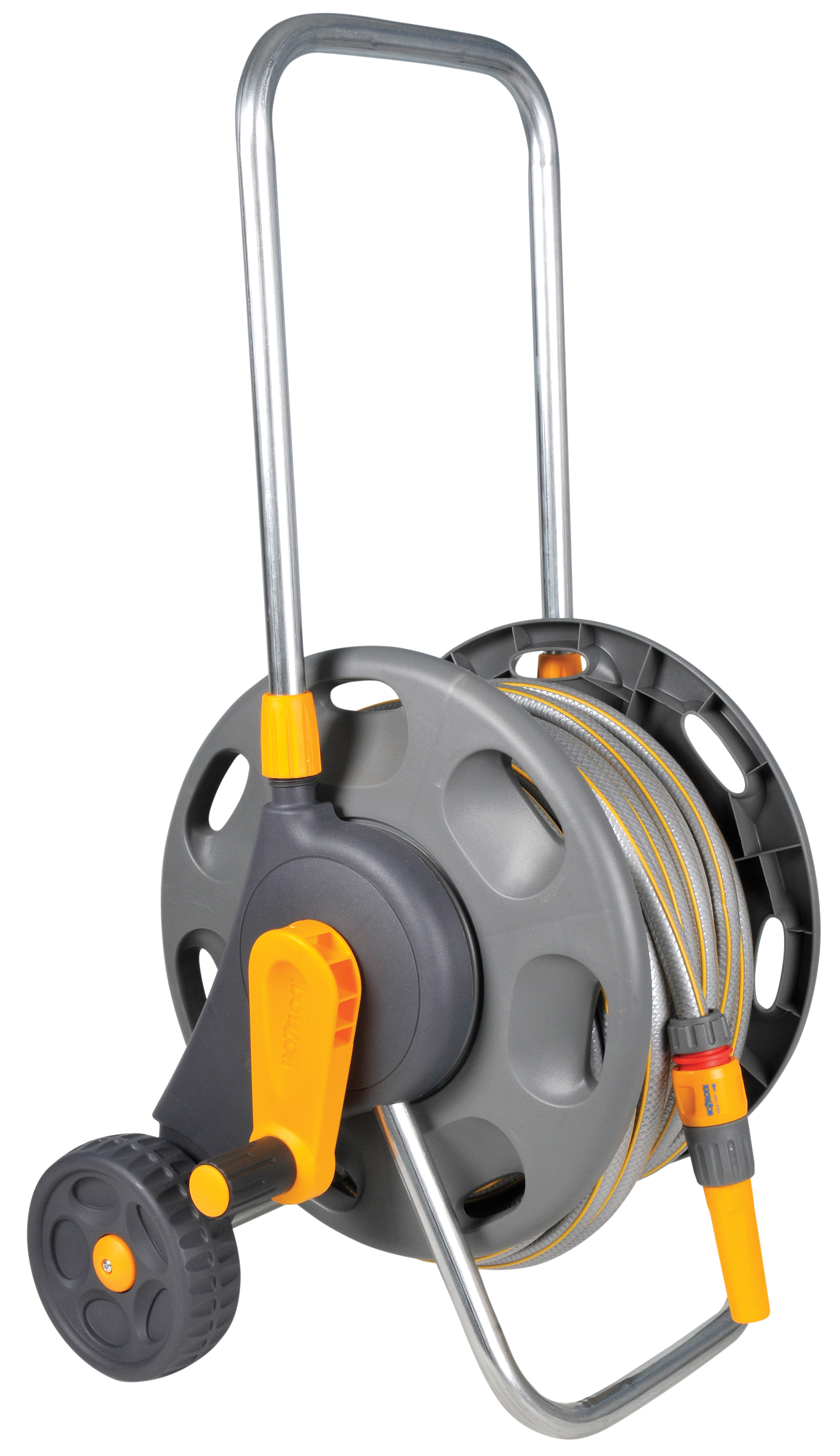 Hozelock slangevogn med hjul inkl 20m kryssarmert 1/2" slange. Inkl vannings startsett. 1x hurtigkobling, 1x hurtikobling m/vannstopp. 1x strålerør, 1x krankobling for 1/2" og 3/4".