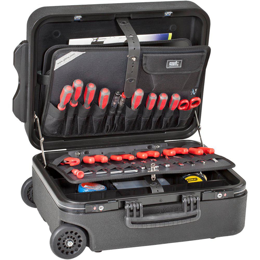 Verktøyveske i støtsikker HDPE (polyetylen med høy tetthet) med doble vegger. Høy motstandskraft mot høye og lave temperaturer og mot de fleste kjemiske stoffer. Teleskophåndtak og store kulelagerhjul for enkel og sikker transport. Svart håndtak med mykt gummigrep, føtter og 2 TSA-låser med nøkler. Kraftig veske som tåler flytransport. Det finnes et stort utvalg av reservedeler for reparasjon eller utskifting av deler til denne vesken. Innhold: 1 verktøyvegg med lommer på begge sider, en verktøyvegg med lommer på den ene siden og 2 små lagerbokser. Verktøylommene har et elastisk bånd øverst som holder verktøyene på plass. Verktøy medfølger ikke.